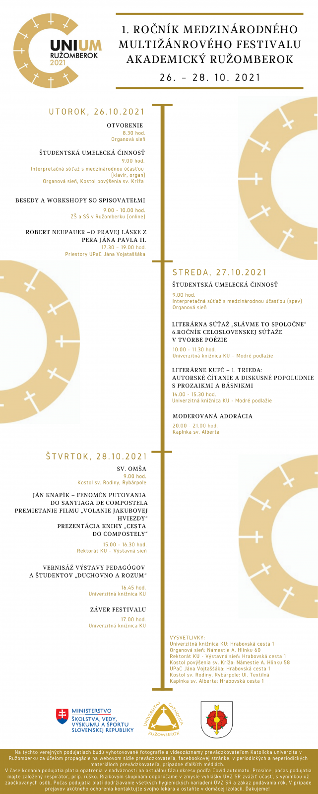 Vzhľadom na dynamickosť pandemickej situácie budú jednotlivé činnosti festivalu prezentované aj v online priestore. Počas festivalu budú prebiehať súťaže, umelecké a vedecké semináre, besedy s umelcami a osobnosťami verejného života, výstavy a sprievodné aktivity Univerzitného pastoračného centra Jána Vojtaššáka.