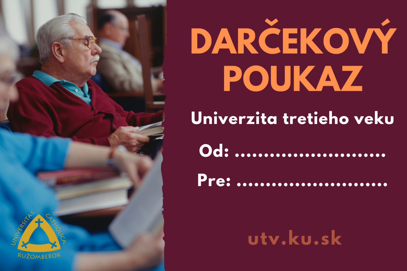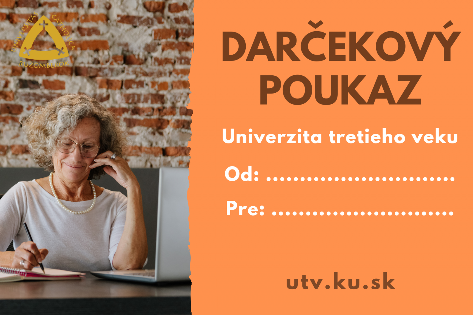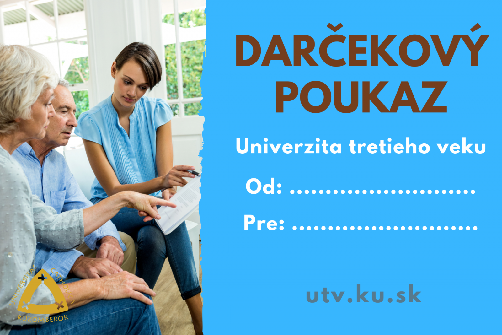 Darujte užitočné vzdelávanie na Univerzite tretieho veku (UTV) Vašim rodičom alebo starým rodičom. Po zaplatení ročného poplatku za Vami vybraný vzdelávací program UTV Vám vystavíme originálny darčekový poukaz podľa Vášho výberu.