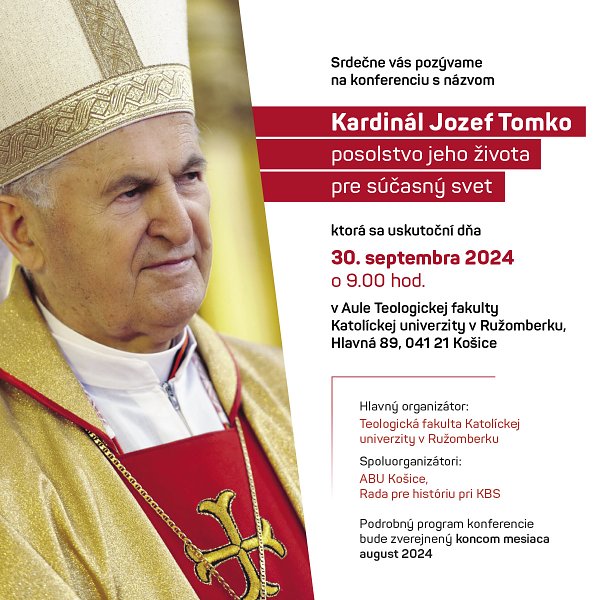 Kardinál Jozef Tomko – posolstvo jeho života pre súčasný svet, ktorá sa uskutoční dňa 30. septembra 2024 o 9.00 hod. v Aule Teologickej fakulty Katolíckej univerzity v Ružomberku, Hlavná 89, 041 21 Košice